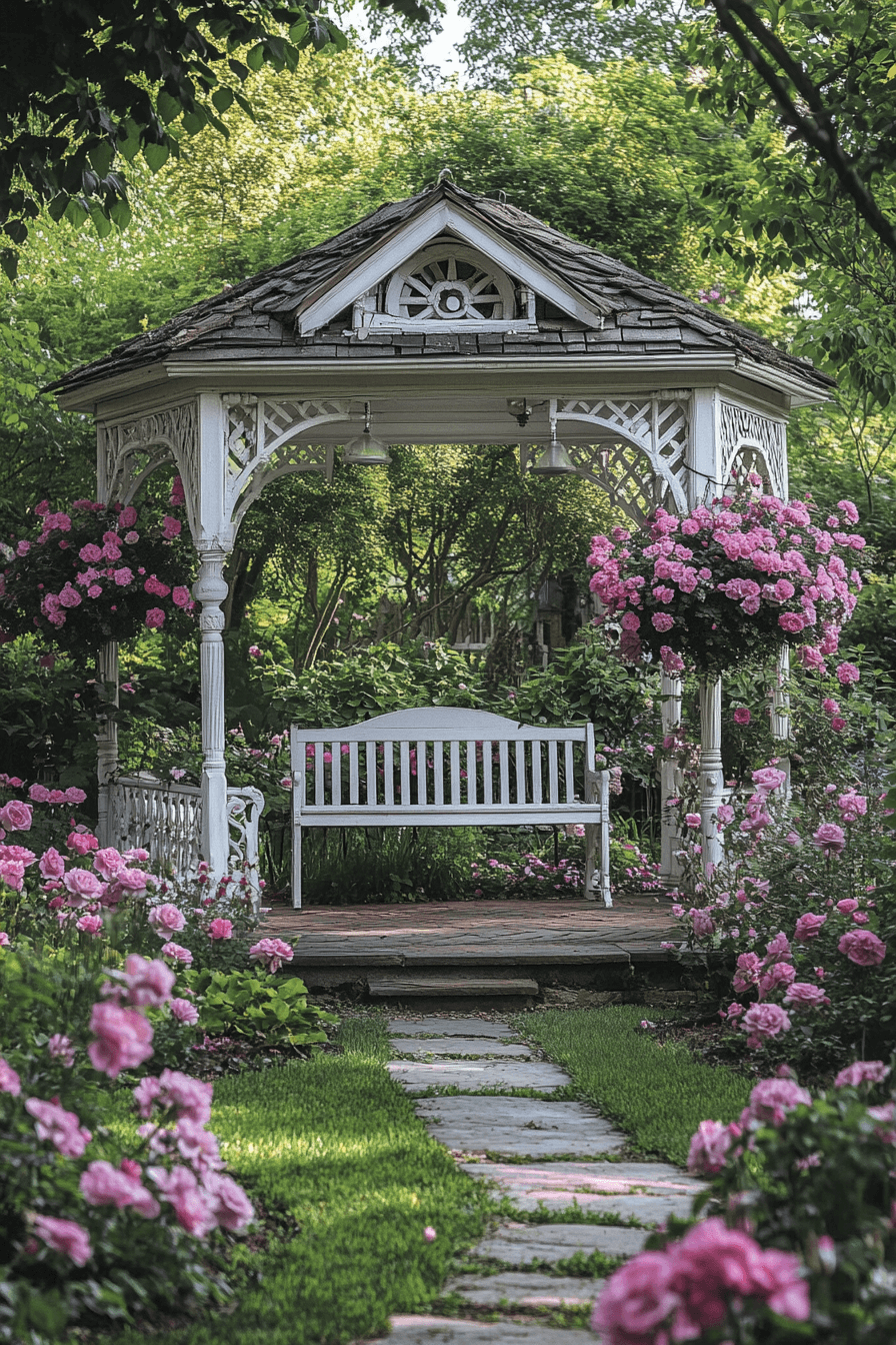 Make a bold impression with antique yard decor ideas that center around old-world gazebos filled with craftsmanship and character. Choose a structure with carved wood details or ornate metalwork to serve as a garden focal point. Add climbing roses or wisteria to wrap the frame in natural color and scent. Beneath the canopy, place vintage-style seating for tranquil afternoon moments. This setup offers beauty, shade, and a feeling of timeless sophistication.