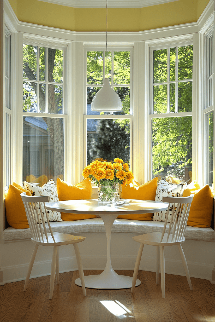 Morning sunlight can transform a cozy corner into one of the most uplifting breakfast nook ideas in your home. Large windows allow natural light to flood the space, creating a bright and cheerful start to the day. A round table paired with comfy chairs fits neatly into the corner while keeping the layout open and functional. Soft curtains provide privacy while still letting the sunshine pour through. Pops of yellow in cushions or decor add a vibrant, feel-good energy to the room. Explore more sunny breakfast nook ideas that will brighten every morning!