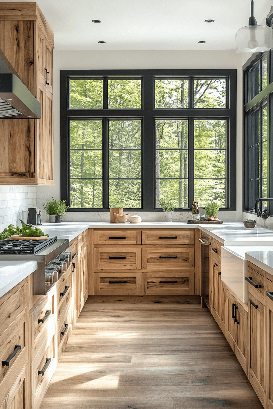 A horizontal grain pattern gives hickory kitchen cabinets a bold and modern visual flow. Instead of the traditional vertical layout, the grain runs across the cabinet fronts for a unique effect. This design choice can make the kitchen appear wider and more open. Seamless grain alignment across doors and drawers creates a beautifully cohesive look. Pairing this style with flat-panel cabinetry or hidden handles enhances the streamlined appearance. Discover more ideas and see how horizontal hickory kitchen cabinets can transform your space!