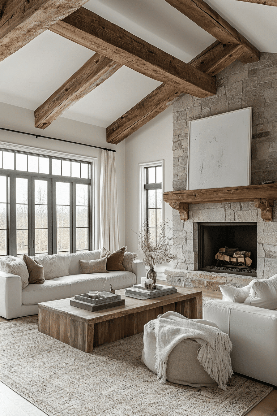 This modern farmhouse interior blends exposed wood beams with clean-lined furniture to create a space that feels both cozy and elevated. Soft neutral tones keep the room bright while layered textures add depth and comfort. Oversized windows invite the outdoors in, making the space feel open and refreshing. A statement fireplace anchors the room with warmth and timeless charm. Every detail strikes a balance between rustic character and modern ease.